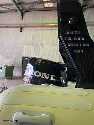 Πωλείται εξαιρετικό σκάφος Mostro 6.21 OFFSHORE, μοντέλο 2010, σε άψογη κατάσταση. Έχει μήκος 6.5 μέτρα, χωρητικότητα 8 ατόμων και ιπποδύναμη 150 hp, με εξωλέμβια τετράχρονη μηχανή βενζίνης που καταναλώνει μόλις 0,80 λ/100χλμ. Το σκάφος διαθέτει πλούσιο εξοπλισμό, όπως ηλεκτρική άγκυρα, βυθόμετρο Garmin με GPS 9 ιντσών, υδραυλικό τιμόνι, roll bar, δερμάτινα καθίσματα, προβολείς, δεξαμενή νερού, ηλεκτρικό εργάτη άγκυρας, κουκούλα, plotter, βοηθητική μηχανή, υδατοπαγίδα, δεξαμενή λυμάτων, πασαρέλα, GPS, ραδιοκασετόφωνο και δάπεδο 3M σε στυλ ξύλου. Διαθέτει επίσης δύο καινούργιες μπαταρίες και δύο υδατοπαγίδες. Όλα τα service έχουν γίνει στην αντιπροσωπεία της Honda. Το σκάφος πωλείται με τρέιλερ και είναι χωρίς ζημιά. .
